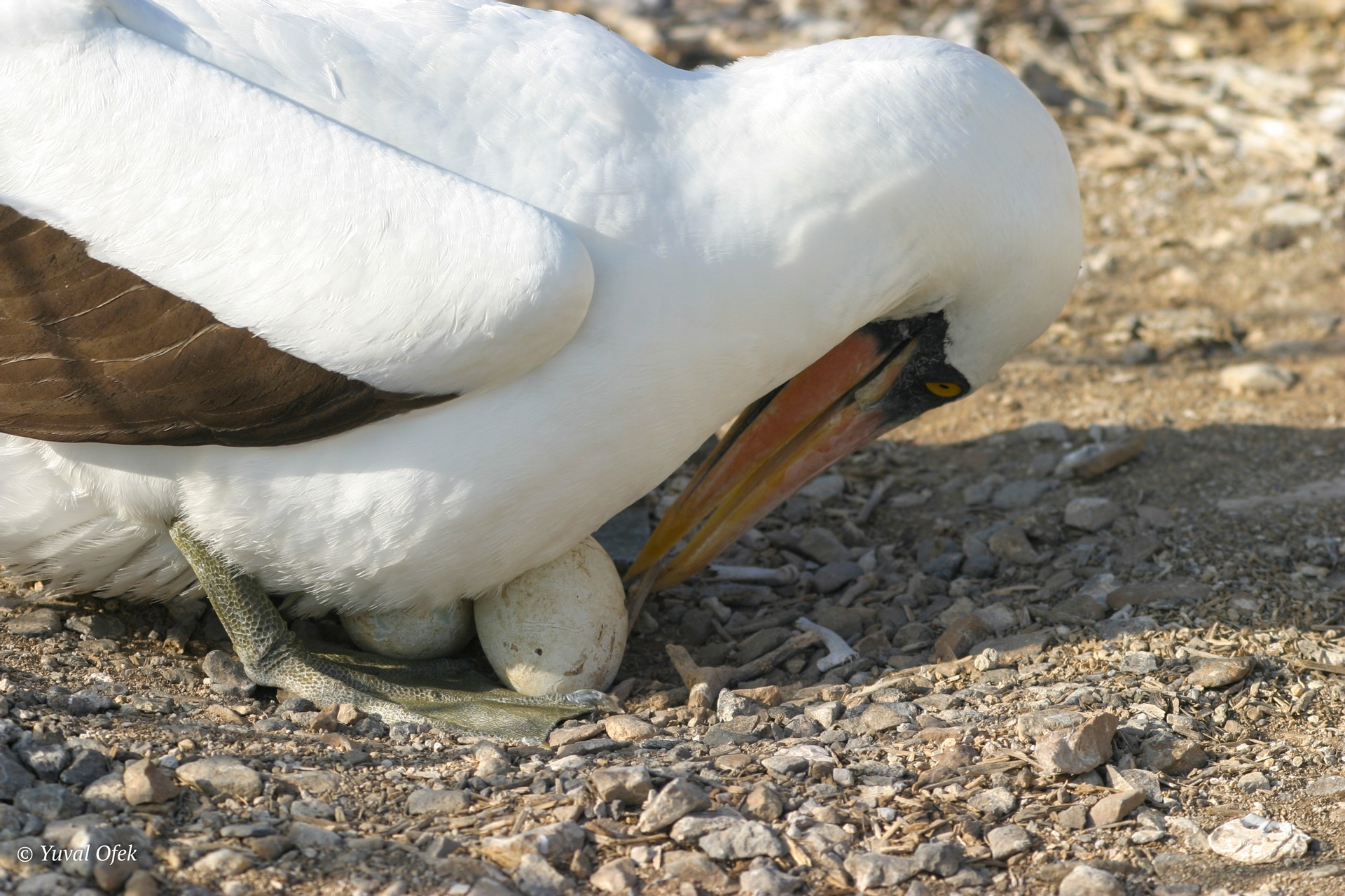 Nazca Booby making sure her eggs are gathered together and safe