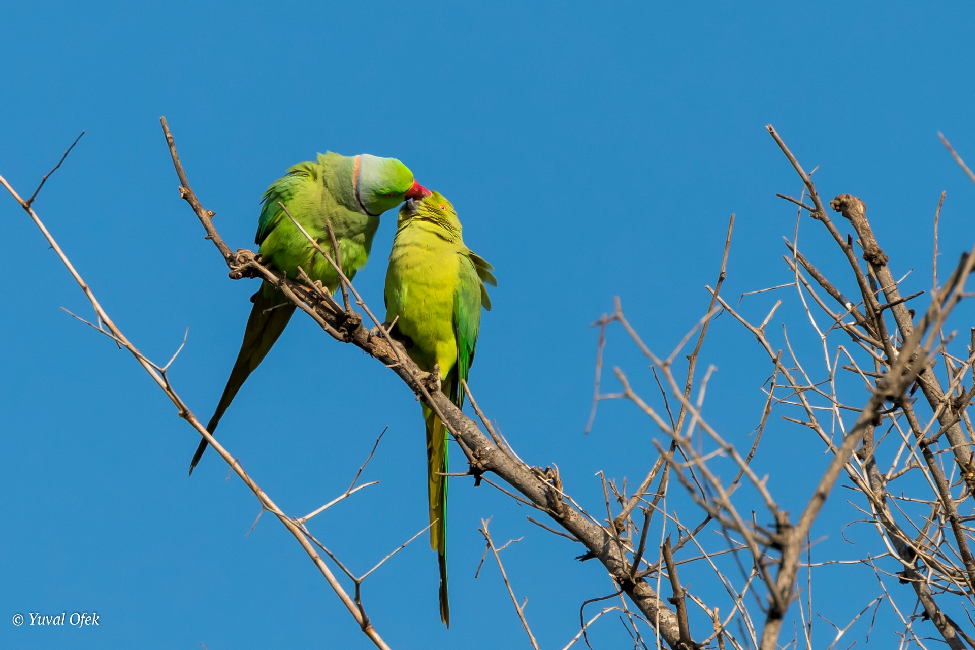 Rose-ringed Parakeet mom feeding its chick