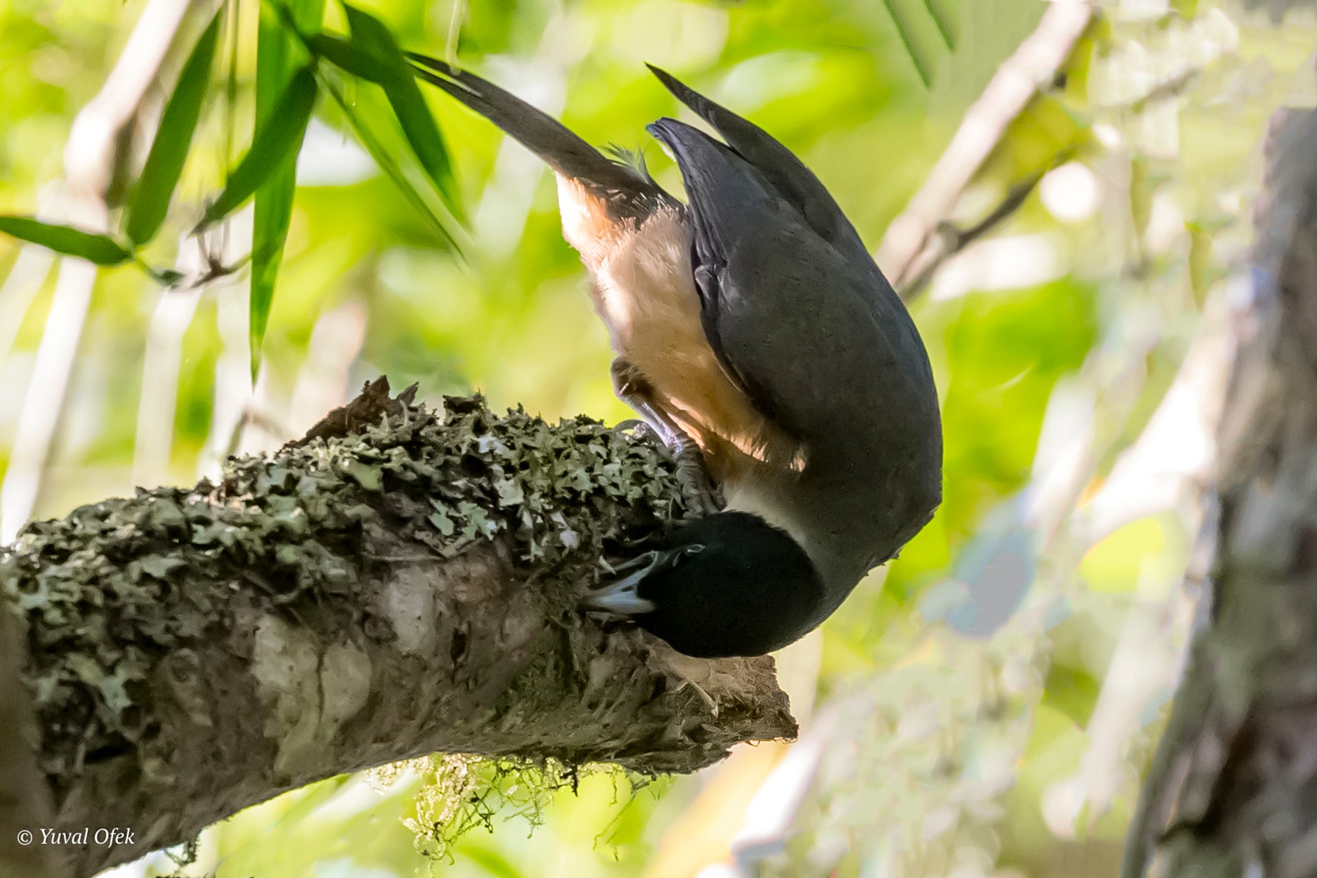Tristram's Starling acrobatic reach catching a hornet