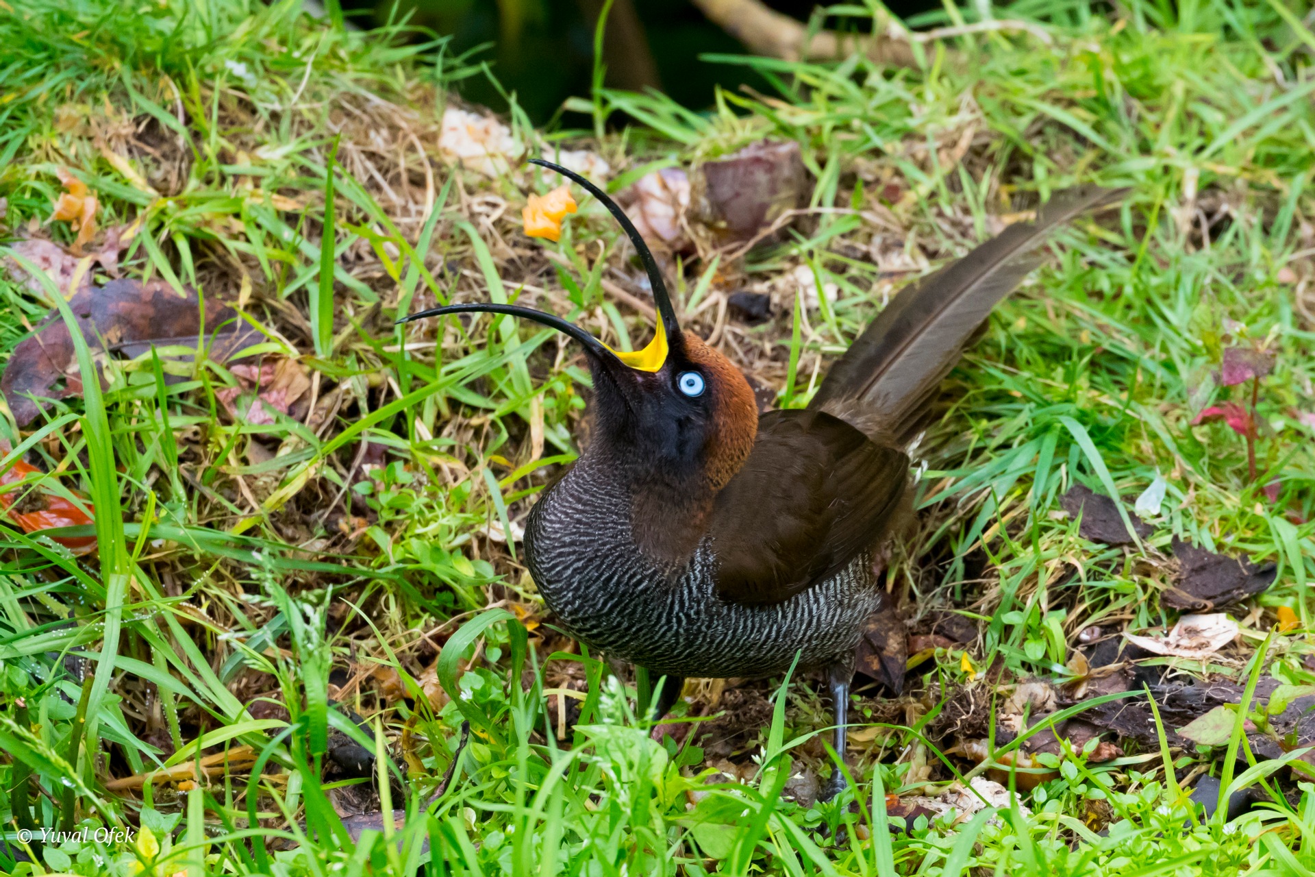 Brown Sicklebill swallowing a piece of papaya