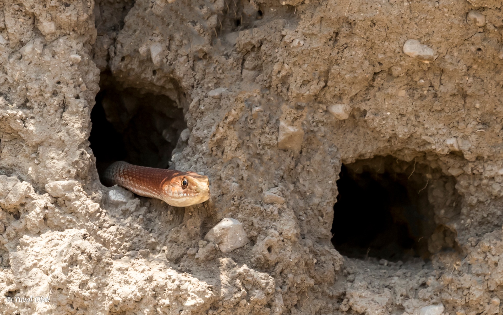 Montpellier snake peeking from a Bee-eater's nest