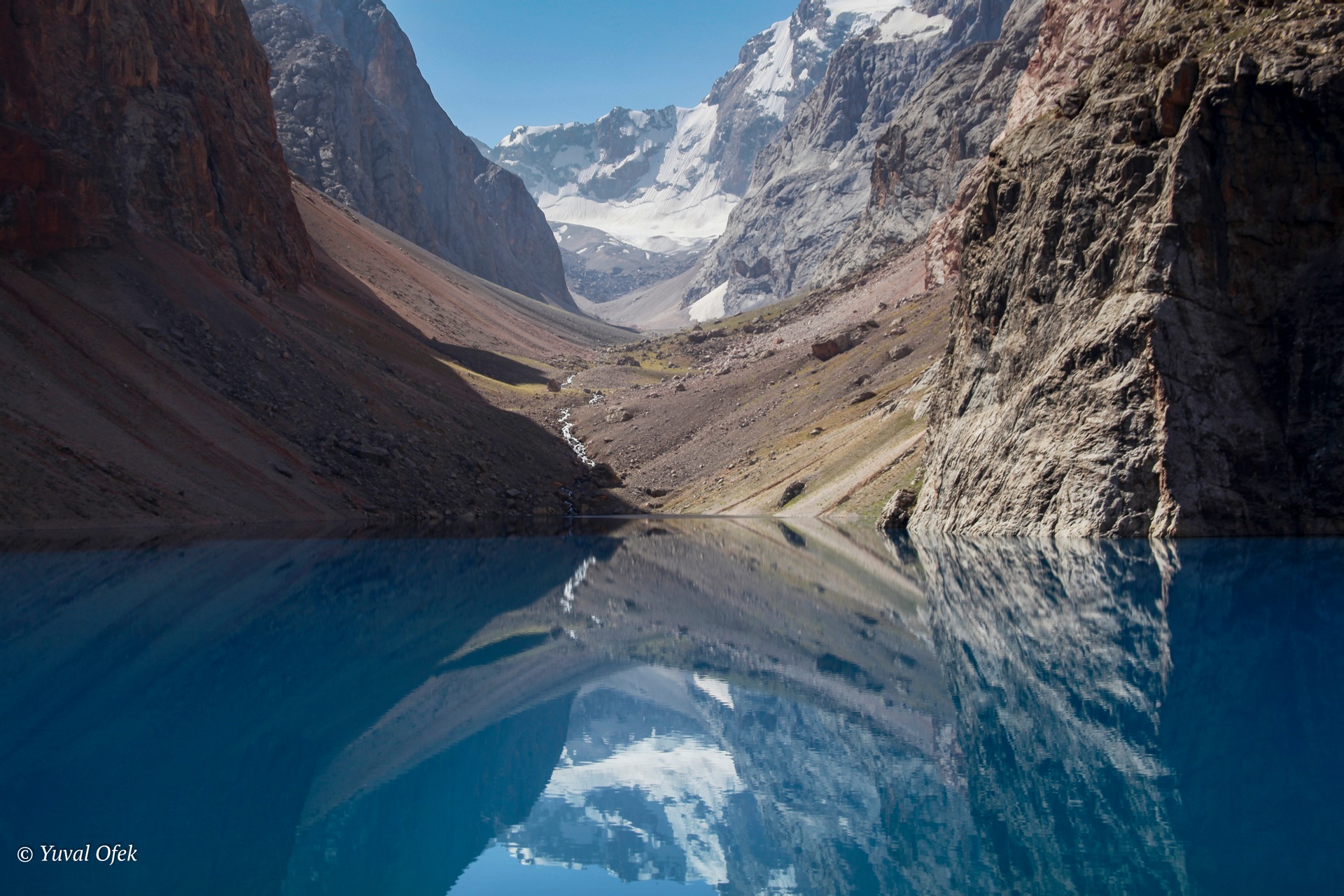 Water and earth arcs, Early morning reflection on a glacier water lake , formed high within the Pamir mountains.