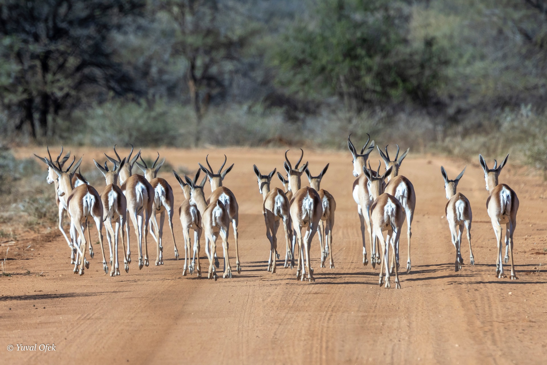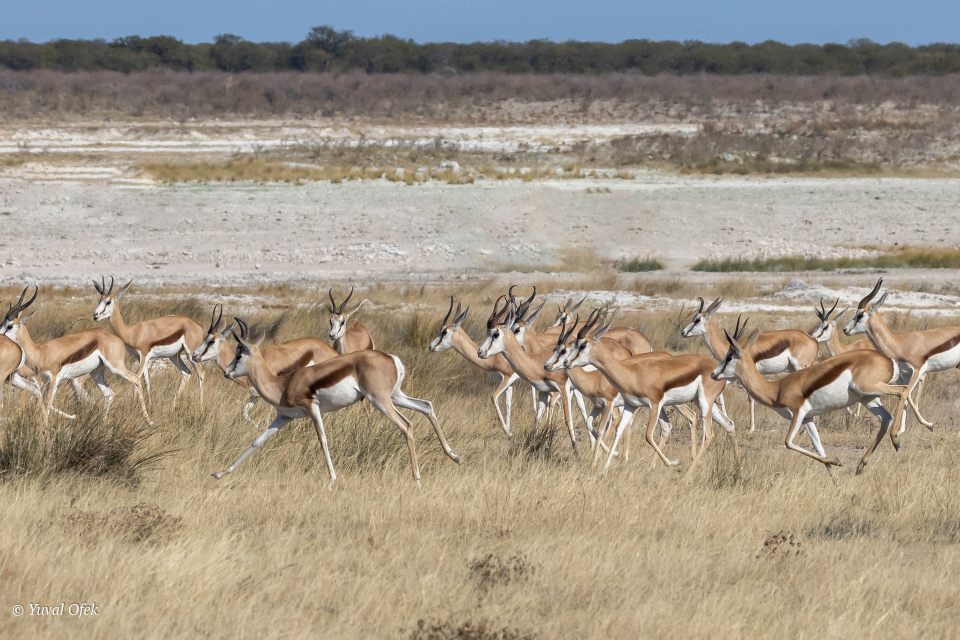 Springbok herd escaping a lioness