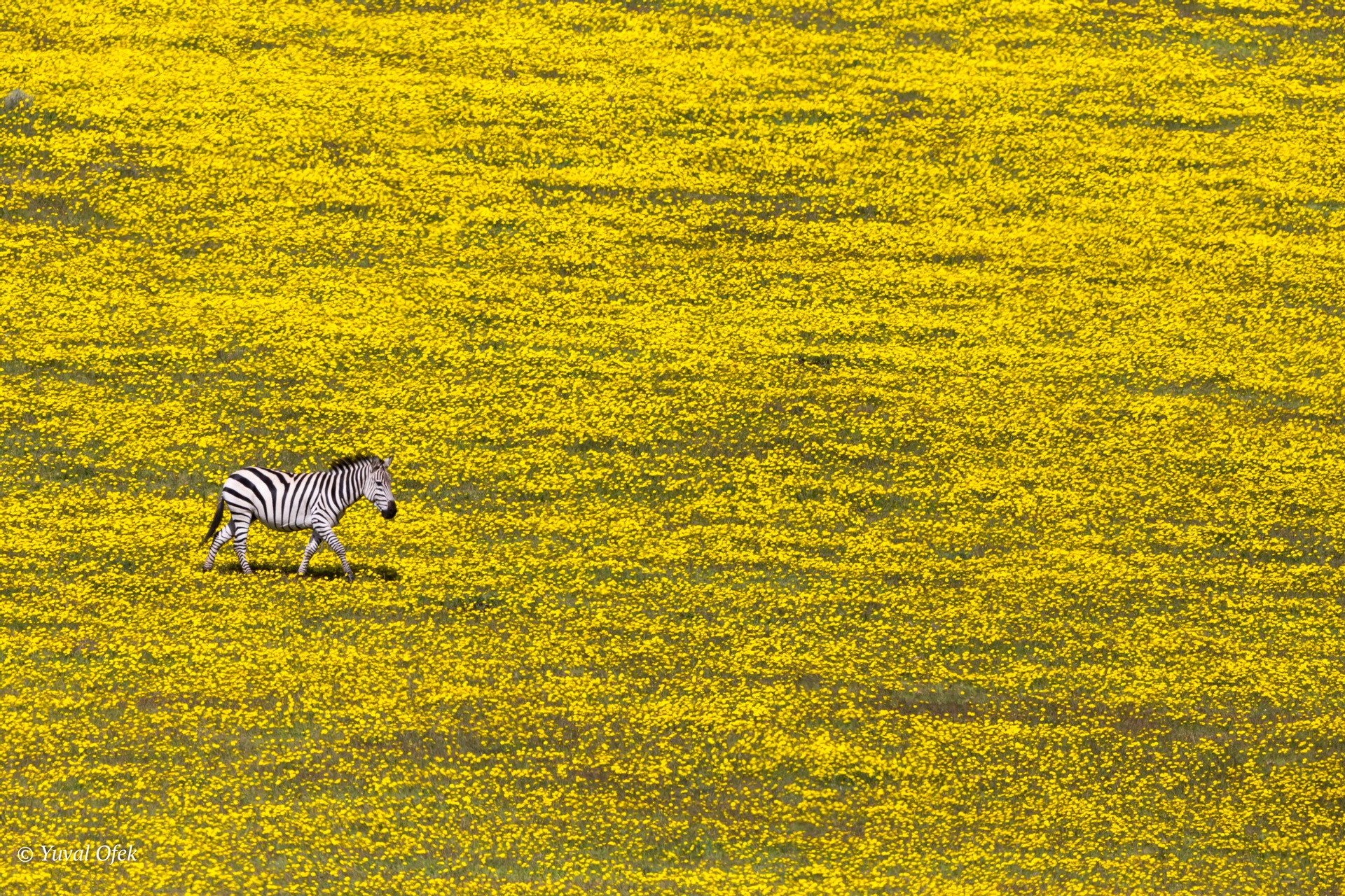 A rare view of a lonely zebra, in the midst of a blooming field