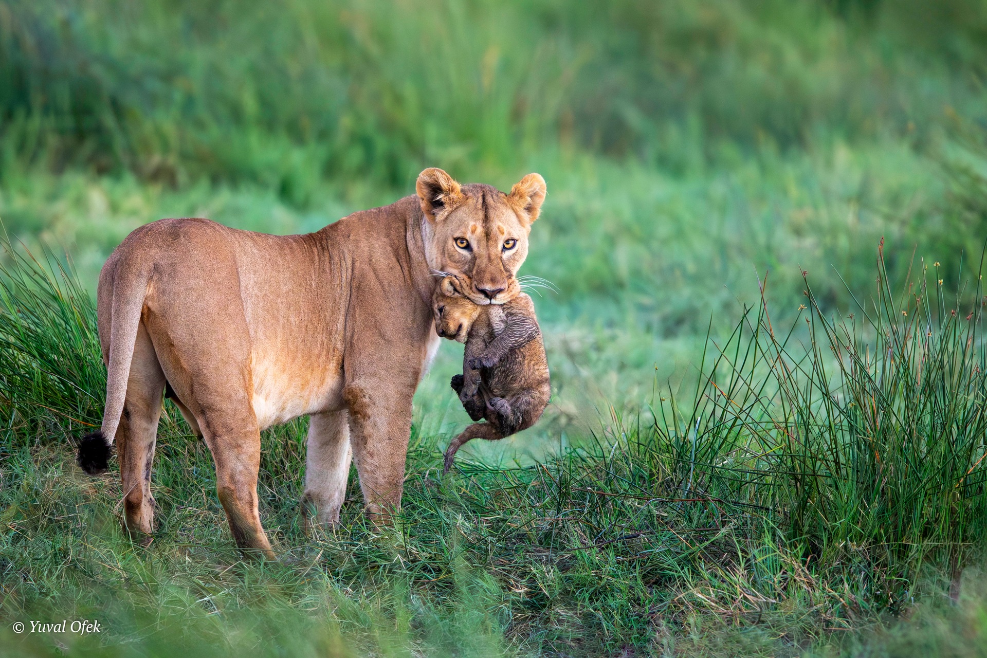 A mother lioness with four cubs must carry her newborns across marshland to hide them from predators.
