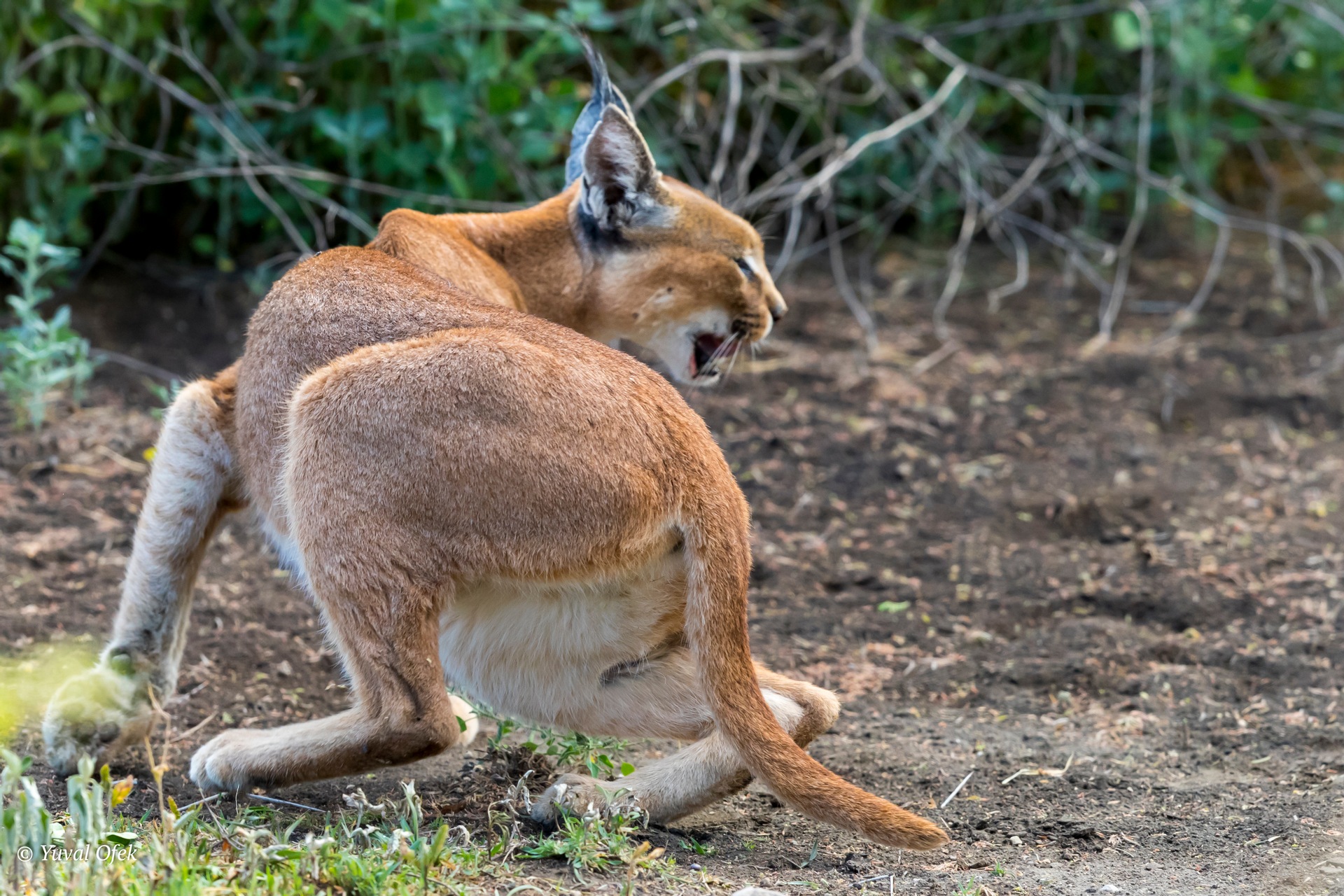 A female Caracal in a sudden turn during a mouse hunt