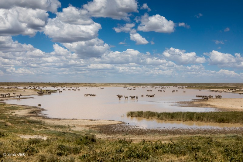 Zebra and Wildebeests gather around a large water pond in Ndutu reserve