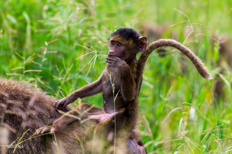 Best seat out there... A very young Olive Baboon is taking advantage of his mom's creative support.