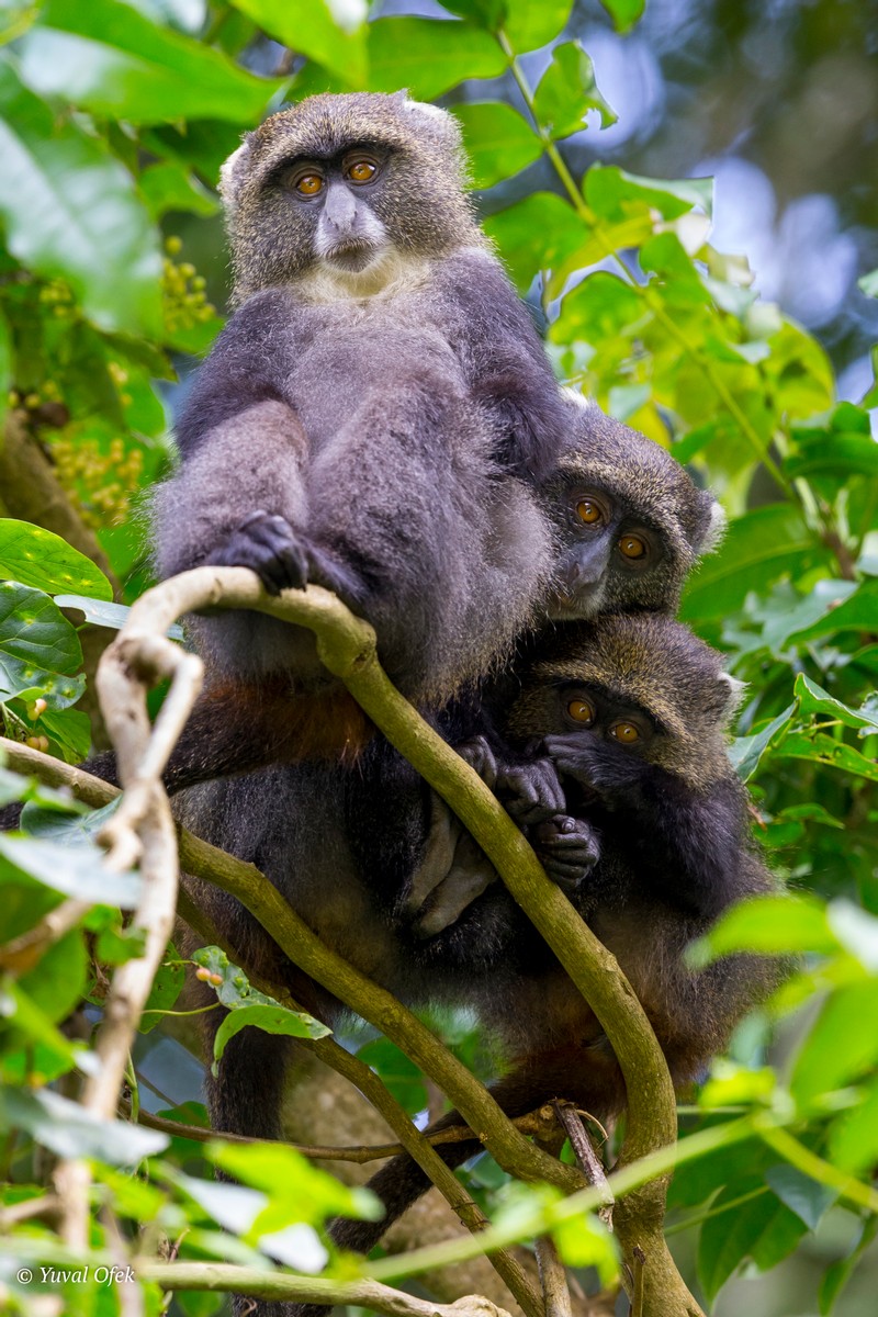 Two young Blue Monkey babies hiding behind their mom...too curious not to peek
