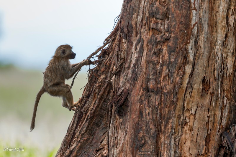 A cheerful baby Baboon rappelling on a tree's air roots